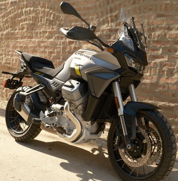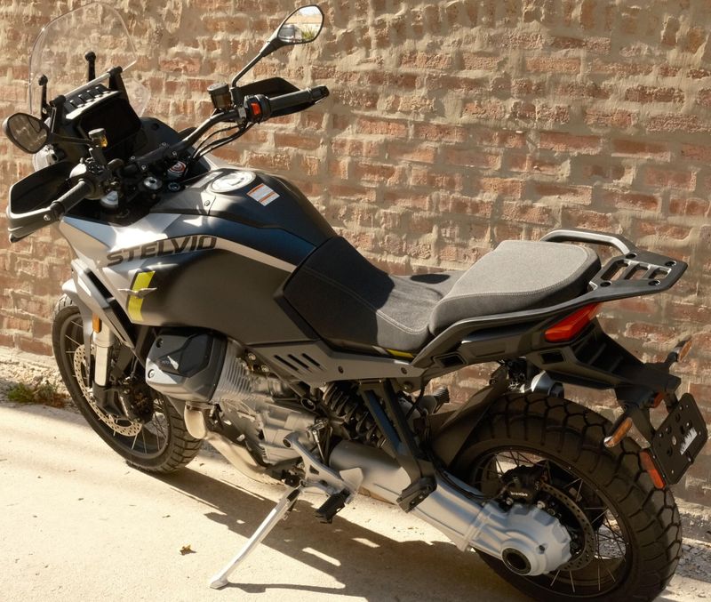 The 2025 Moto Guzzi Stelvio is a premium adventure-touring motorcycle that combines Italian craftsmanship with modern Euro 5+ compliance. Powered by a 1,042 cc liquid-cooled 90° V-twin engine, it delivers 115 hp at 8,700 rpm and 105 Nm (77 lb-ft) of torque at 6,750 rpm, paired with a smooth six-speed transmission and low-maintenance shaft drive. Built on a tubular steel frame that’s 20% stiffer than the Mandello, the Stelvio offers 170 mm of suspension travel front and rear, providing confident handling on-road and off. Braking is handled by Brembo components with cornering ABS supported by a six-axis IMU, while a 5-inch full-color TFT display gives riders control over multiple ride modes (Touring, Rain, Road, Sport, Off-road), traction control, cruise control, and LED lighting. With a combination of performance, technology, and touring comfort, the Stelvio is built for long-distance adventure with confidence and style.