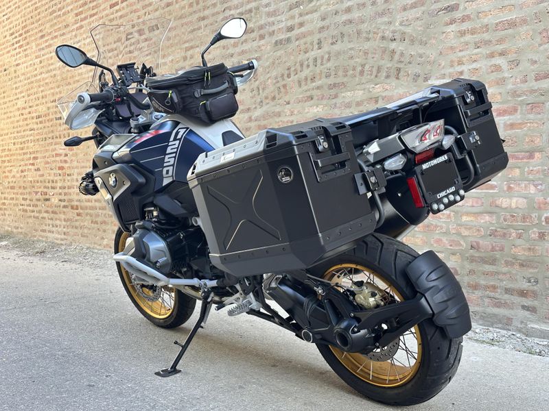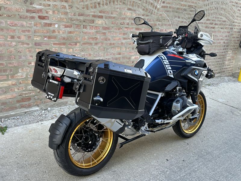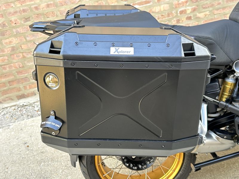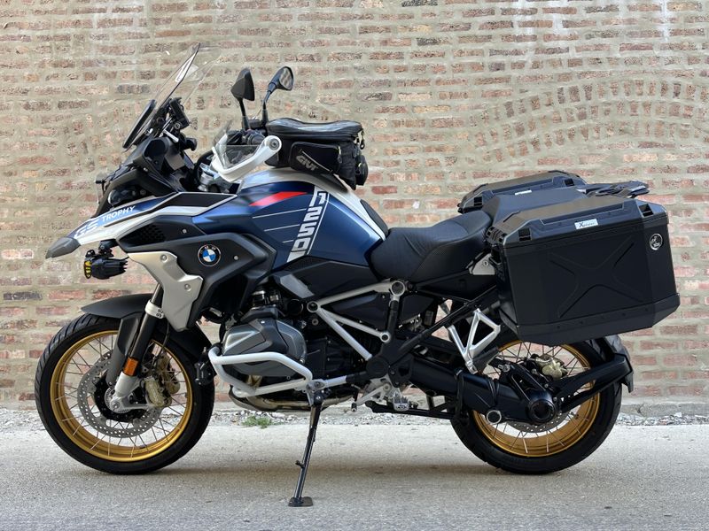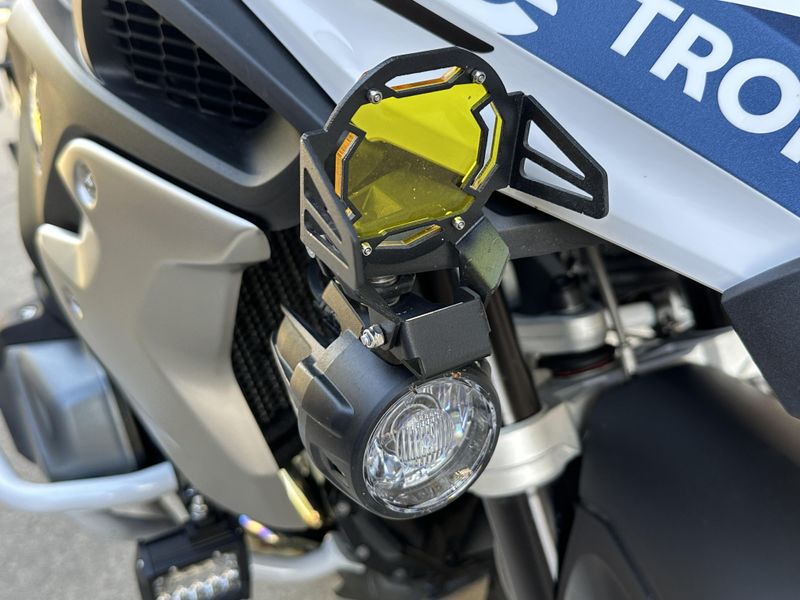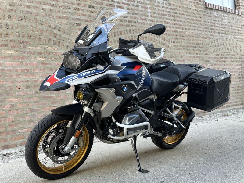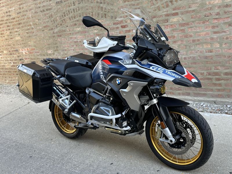 2023 BMW R1250GS Trophy. It's in beautiful condition, it runs and rides great with only 3,818 miles, and it's loaded with Hepco Becker hard bags, GIVI tank bag, headlight protector, auxiliary lights protectors, engine protection bars with additional auxiliary lights, Seat Concepts seat, side stand foot enlarger, and the following factory options: