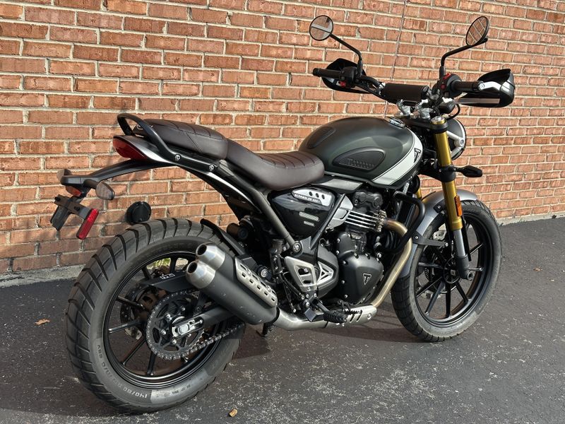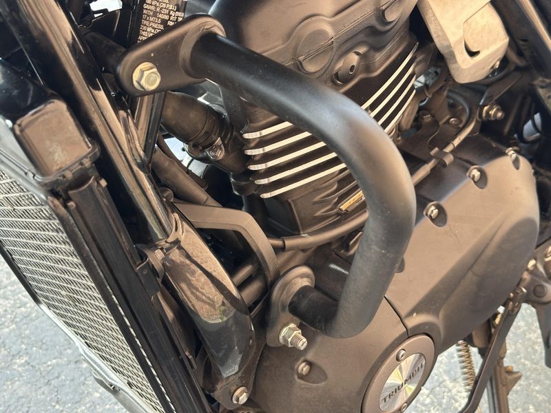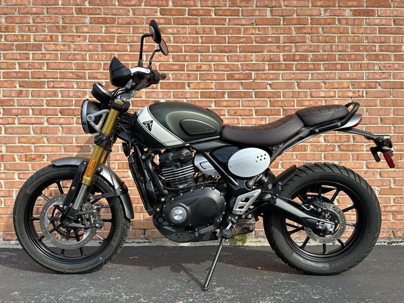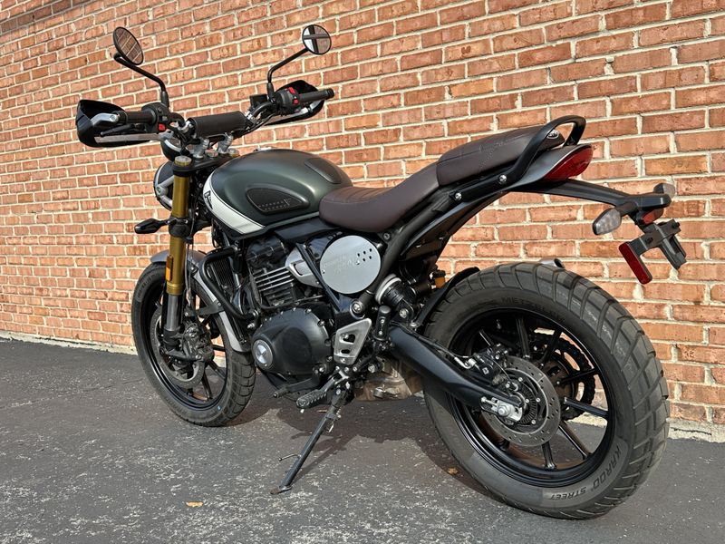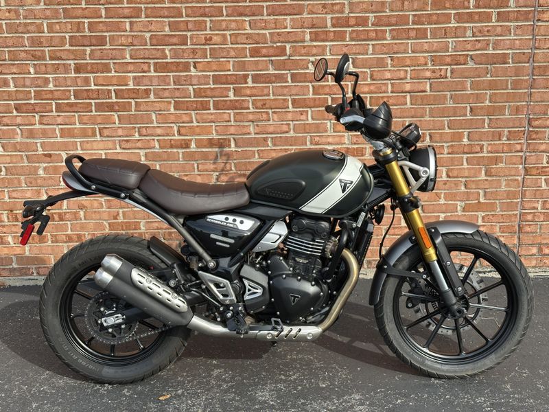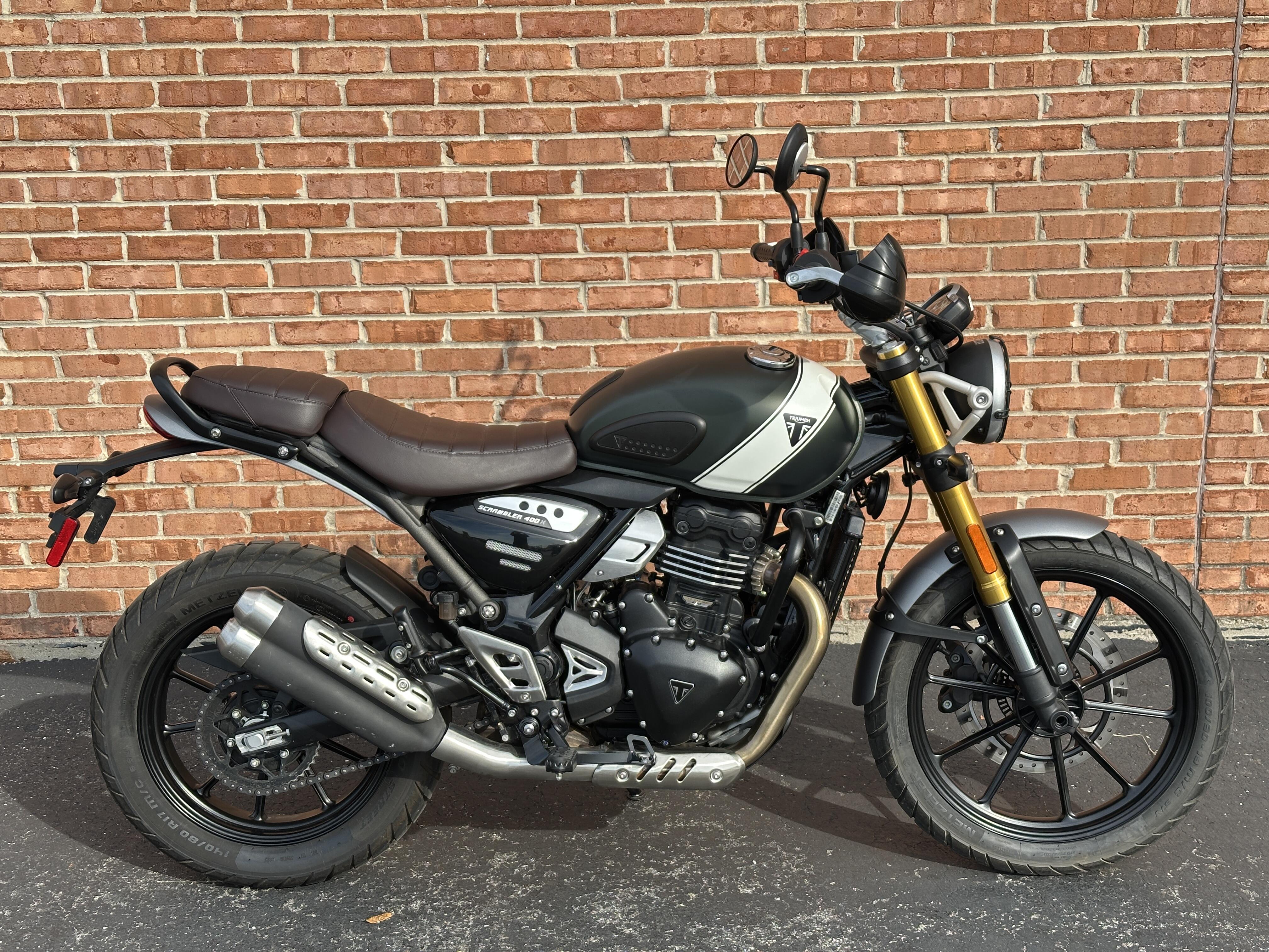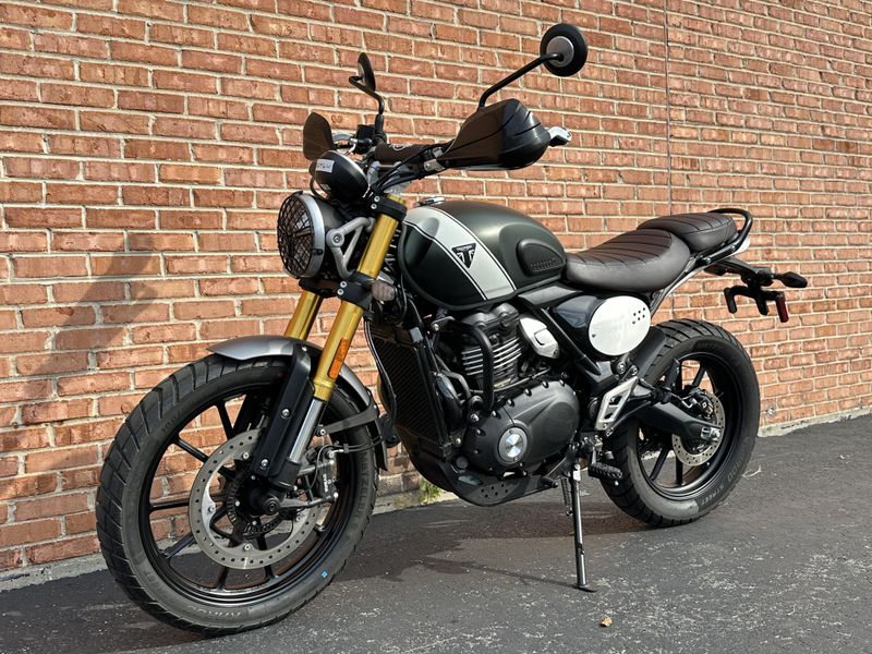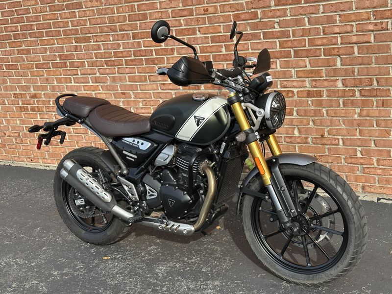 2024 Triumph Scrambler 400 X. Engine protection bars, hand guards, passenger grab bar. It's in beautiful condition, and it runs and rides great with only 3,242 miles.